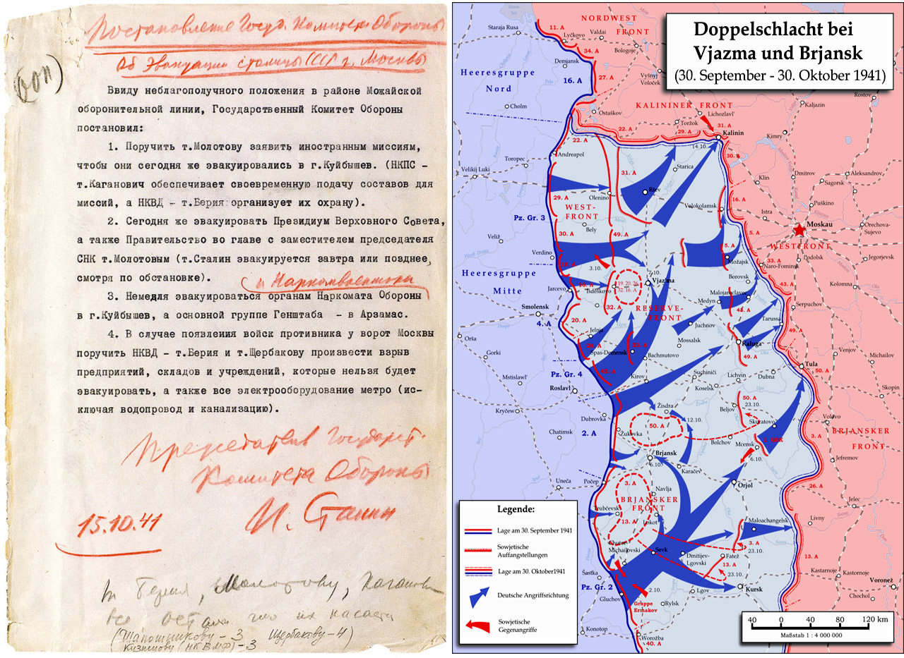 15 октября 1941 года, товарищ Сталин подписал своим "фирменным" красным карандашом секретный приказ о немедленной эвакуации Москвы "ввиду неблагополучного положения в районе Можайской оборонительной линии". Под этим эвфемизмом подразумевался разгром Западного фронта под Вязьмой и Брянском, в результате которого в плен попало около 600 тысяч советских солдат, а немцы за несколько дней продвинулись почти на 100 километров.