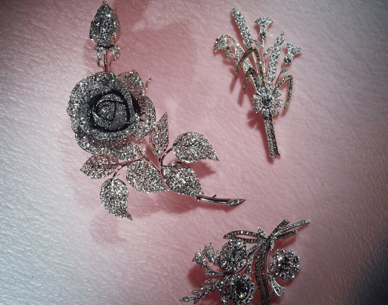Различные броши с бриллиантами и изумрудами в Алмазном фонде СССР.